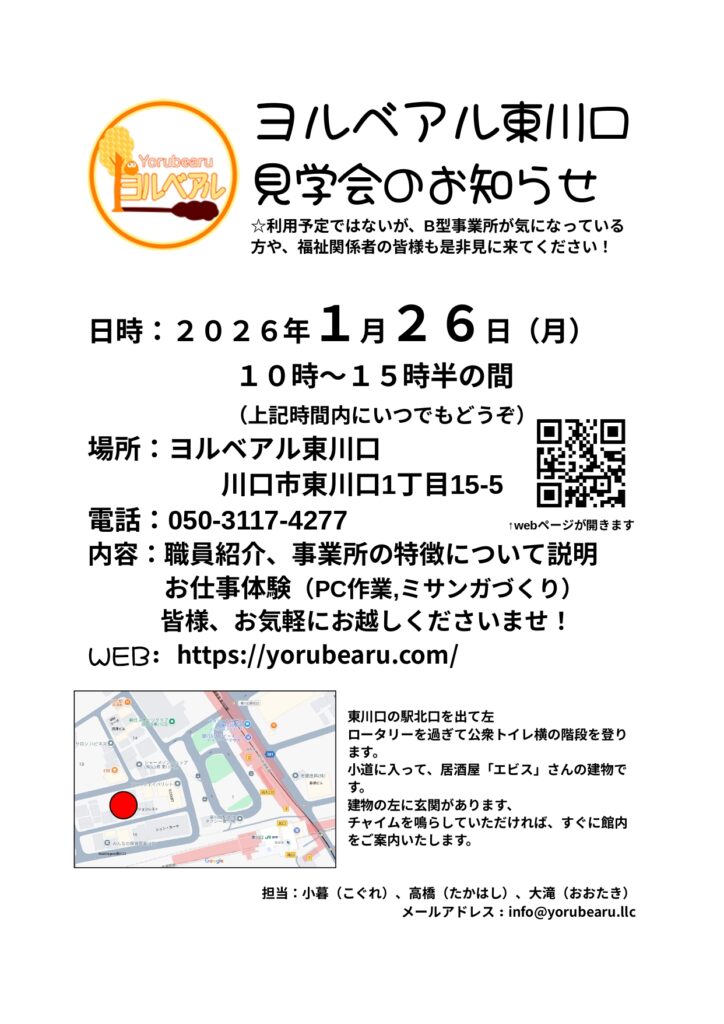 新年最初の見学会です。利用予定でない方でも大歓迎ですので、是非見に来てください。